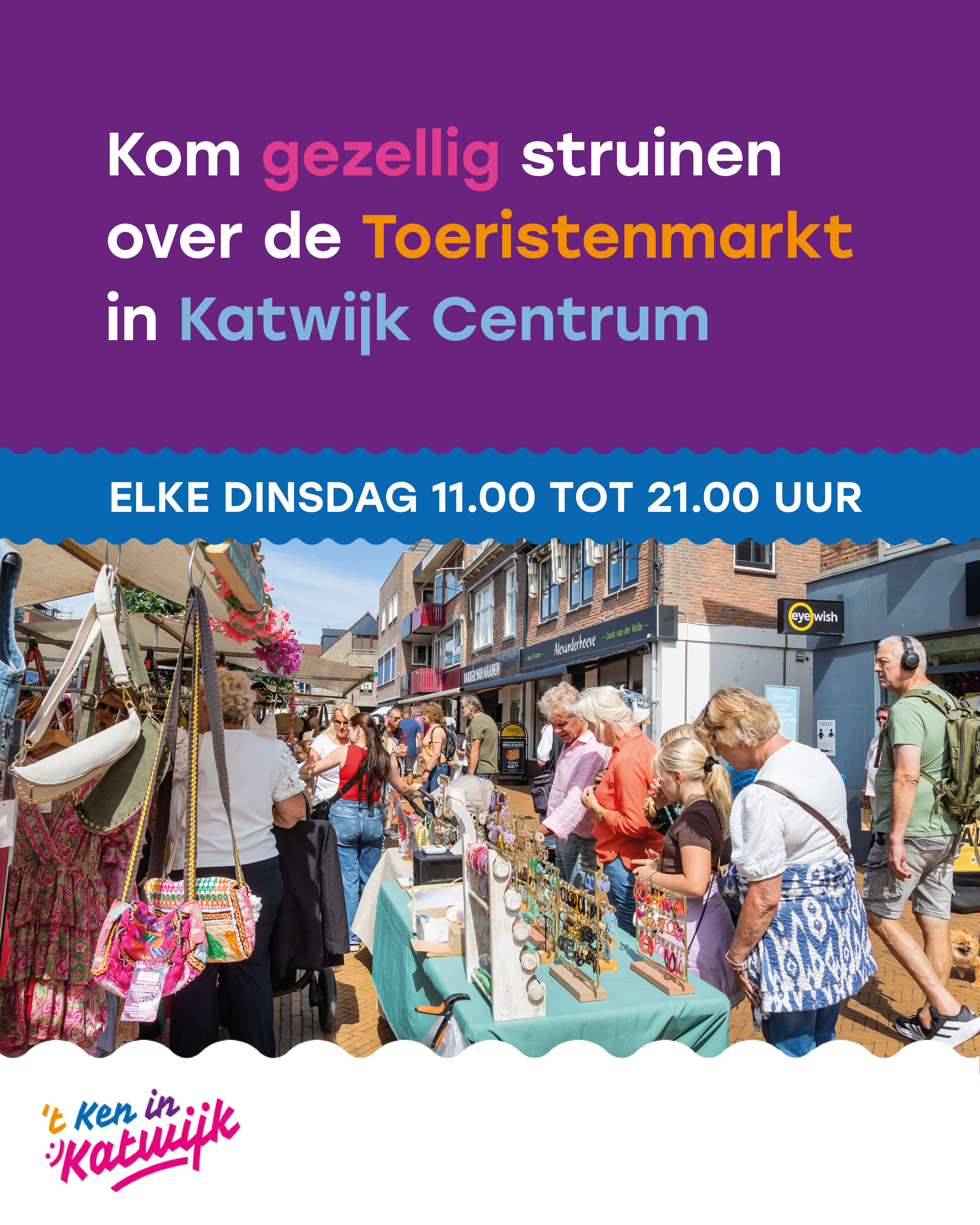 De toeristenmarkten in Katwijk Centrum worden elke zomer op de dinsdagen georganiseerd. Het is de grootste toeristenmarkt van de Bollenstreek. In het gezellige centrum van Katwijk aan zee staan meer dan 130 kramen met de leukste (streek)producten. De eerste van dit jaar is op dinsdag 23 Juni tot en de laatste op dinsdag 25 Augustus. De markt is geopend van 11.00 tot 21.00 uur. Vanaf de markt kan je ook een bezoek brengen aan het prachtige strand van Katwijk aan Zee.